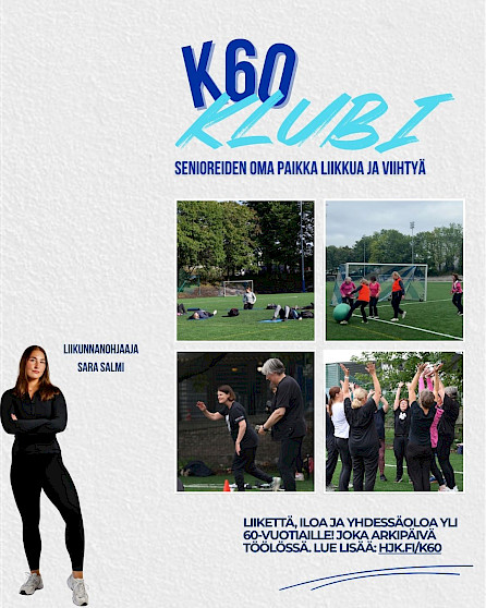 K60 Klubi tarjoaa senioreille monipuolista ja ikäihmisille suunnattua liikuntaa sekä hyvinvointia tukevia aktiviteetteja. Toiminta järjestetään arkipäivisin Töölössä ja jokaisella päivällä on oma teemansa, kuten tasapaino ja lihasvoima, kävely ja ulkoilu tai aivojumppa. Päivittäiset aktiviteetit rakentuvat teeman ympärille. Esimerkiksi ’Tasapaino ja lihasvoima’ -päivinä harjoittelemme kehon hallintaa ja lihaskuntoa yksinkertaisilla ja turvallisilla liikkeillä, jotka tehdään yhdessä ohjaajan johdolla.
